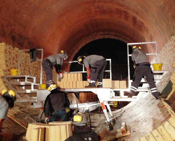 Our ergonomic rolling deck greatly improves kiln lining performance. It is easy to assemble and move inside the kiln, and it will safely support the men and materials needed to install the brick rings up to the spring line.